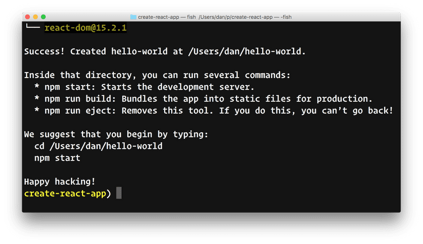 This will take a while as npm installs the transitive dependencies, but once it’s done, you will see a list of commands you can run in the created folder: